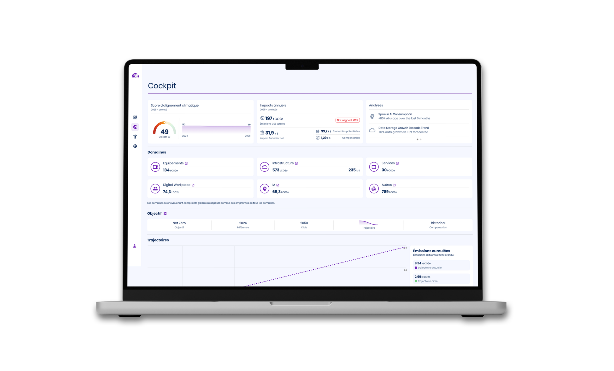 Synchronisez en temps réel vos données IT (cloud, data centers, postes de travail, SaaS) avec les indicateurs ESG pertinents (émissions Scope 1, 2 et 3, consommation énergétique, taux de recyclage, etc.)